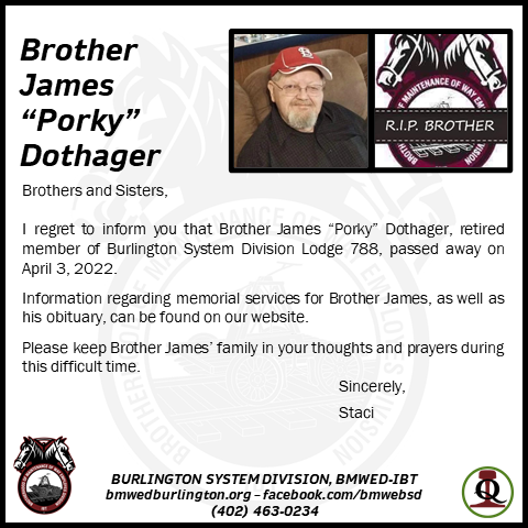I regret to inform you that Brother James “Porky” Dothager, retired member of Burlington System Division Lodge 788, passed away on April 3, 2022.
